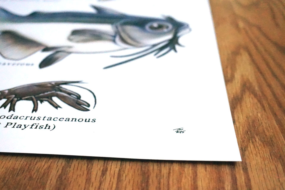 Here is my "Fishes of Vermont" print. A clever eye should be able to pick up of the inspiration behind this highly detailed pencil and watercolor piece. They measures 12" X 36" and are offset printed on recycled 13pt. cover stock(100lb. cover) Signed, numbered and very limited at an edition of 75 these are likely to go fast.
